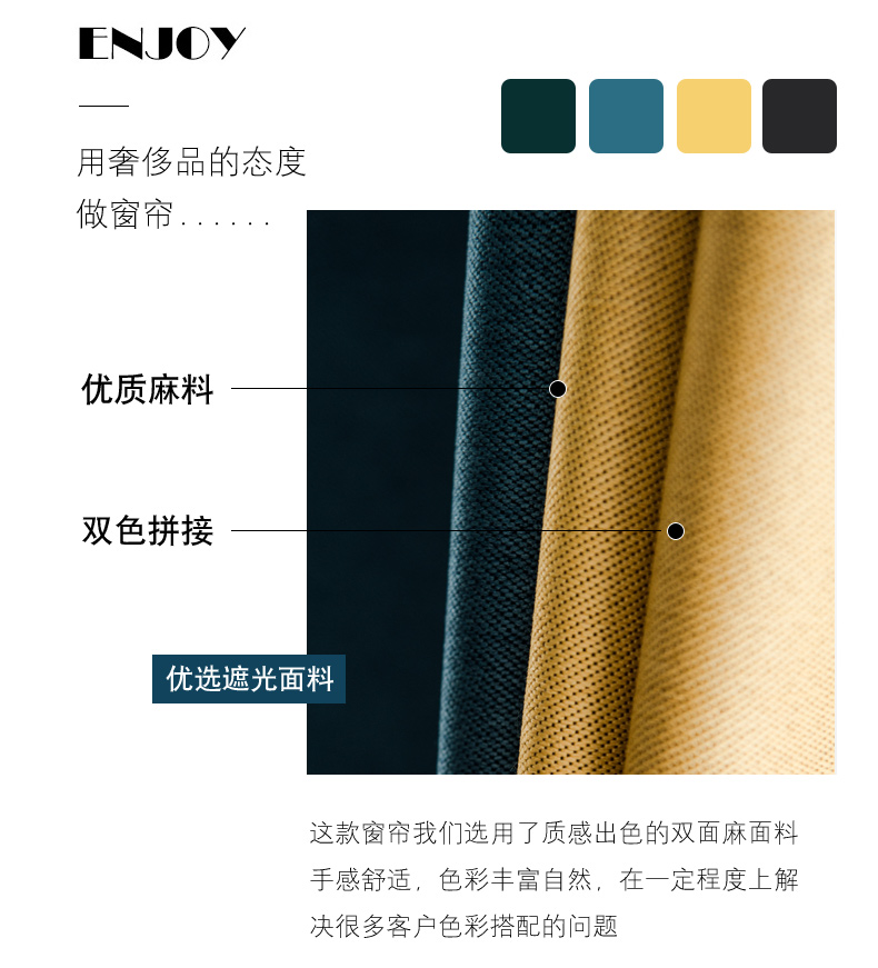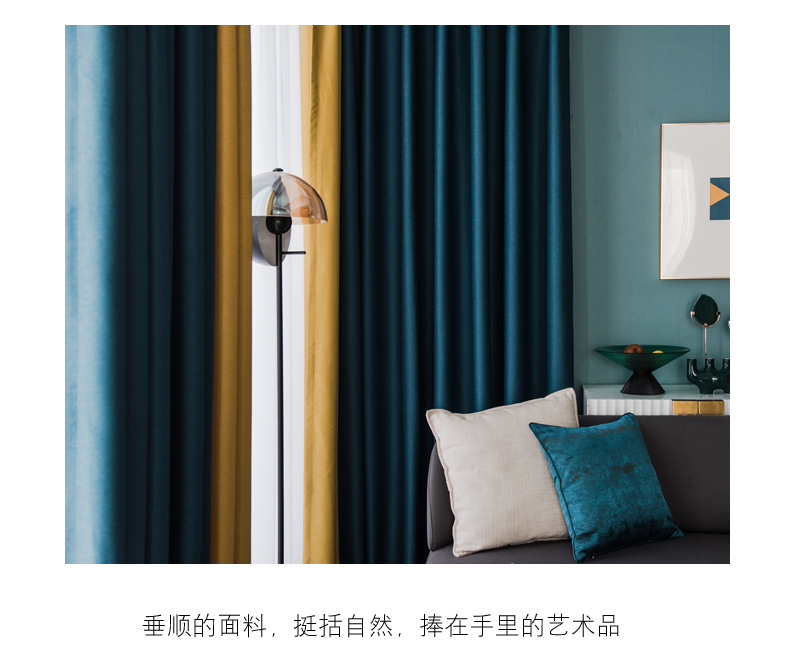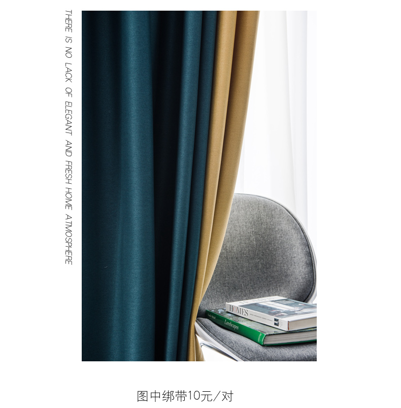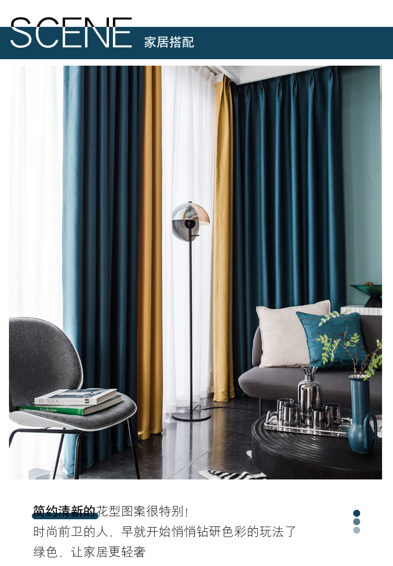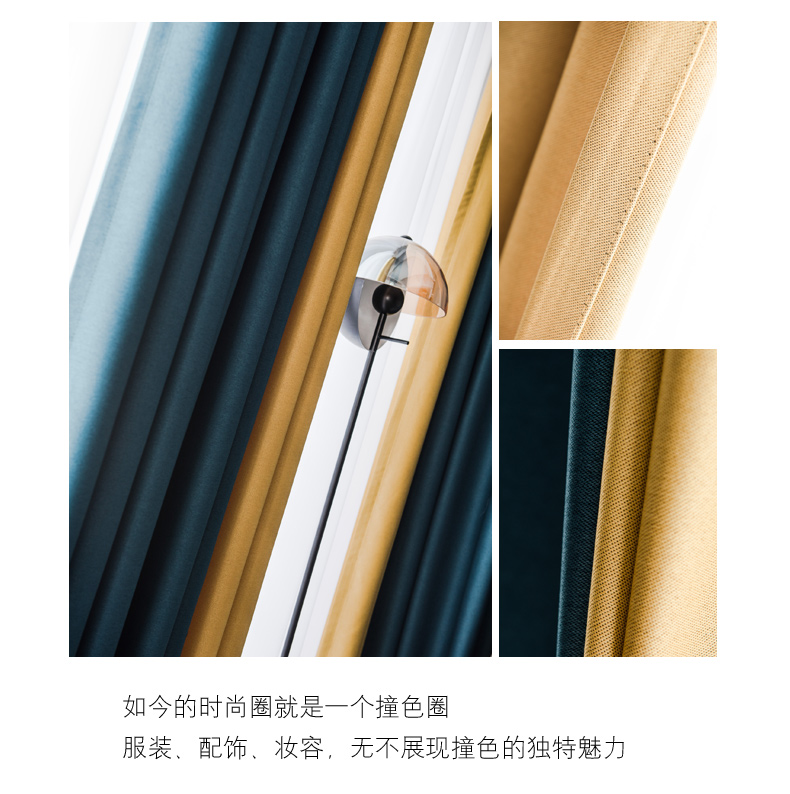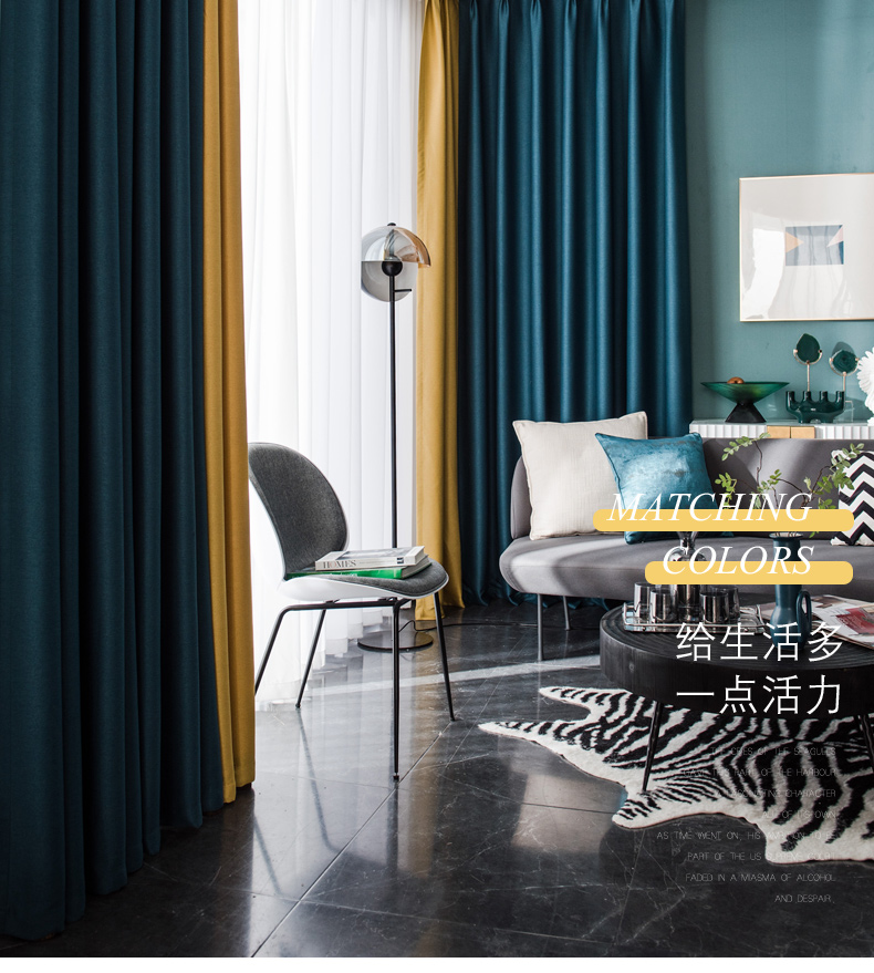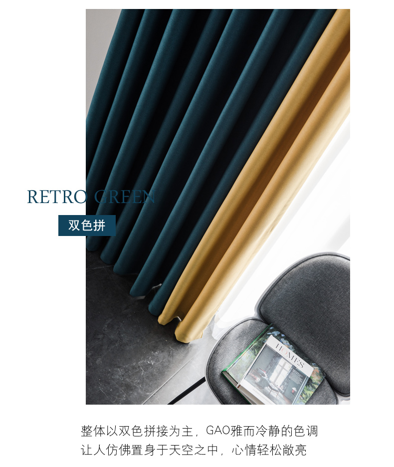 カーテンは厚い布地をプラスして、全遮光100光を通さずに、純色を通して綿麻の寝室の日よけを遮ります。防熱、日よけは軽いです。北欧簡単客間でオーダーメイドした完成品のカーテンは墨緑+レモン黄です。