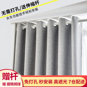 【窗帘+伸缩杆】沫梵 免打孔窗帘布遮光帘安装简易卧室飘窗防风 雾霾灰色 【适合宽1.6米到2.1米窗户】【窗帘高2.0米】