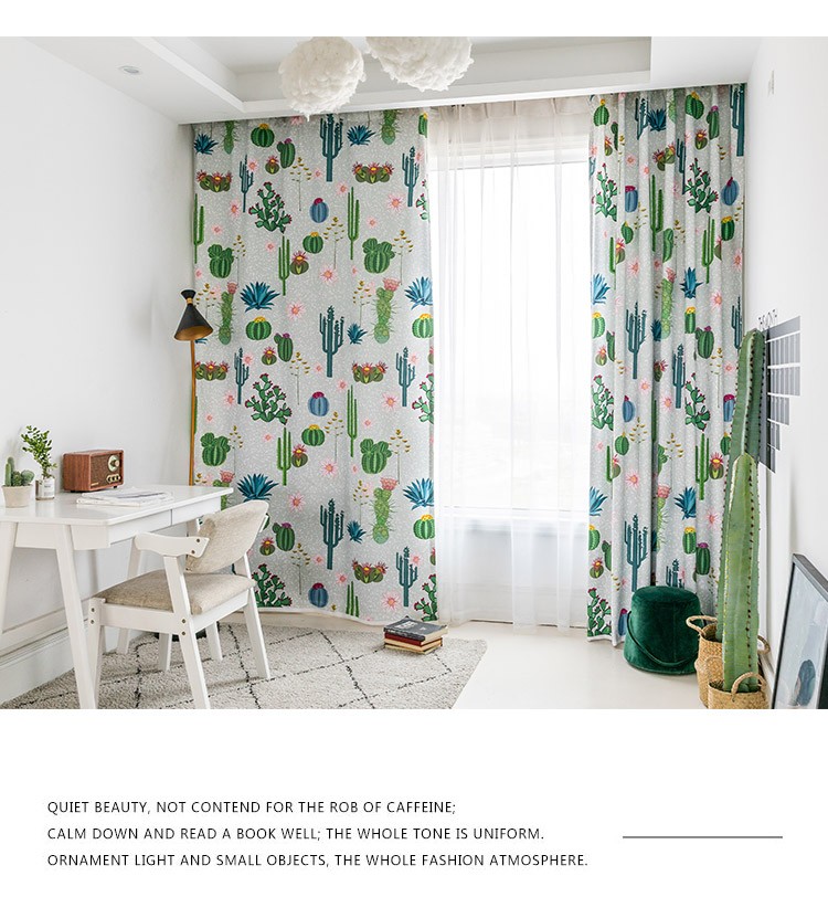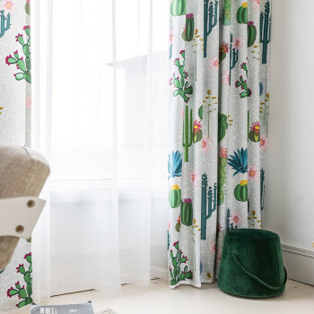 诺罗家纺 北欧简约窗帘成品 韩式田园风仙人掌窗帘布落地遮光客厅小清新飘窗短帘 仙人掌2布普通挂钩款 宽1.5米*高2米/1片