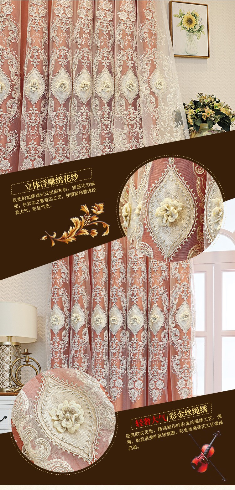 雅汇林简约欧式双层加厚遮光布纱一体成品客厅卧室奢华大气浮雕绣花窗帘 一见倾心-桃粉 宽1.7米*高2.7米/挂钩1片/5朵花