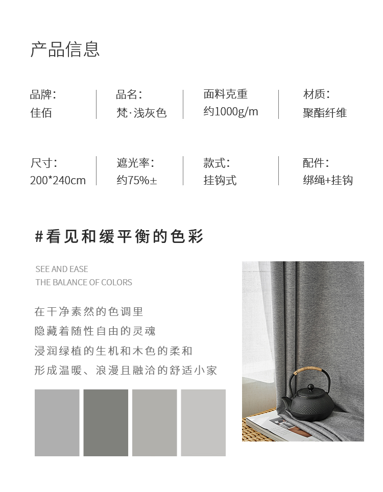 佳佰【京東有ブランド】カーテン新国風禅意既制カーリング・ファブリック生の寝室のリビングルームの窓のサンシェード・サンスクリットの薄い灰のフック式2メートル幅*2.4メートルの高さ1枚