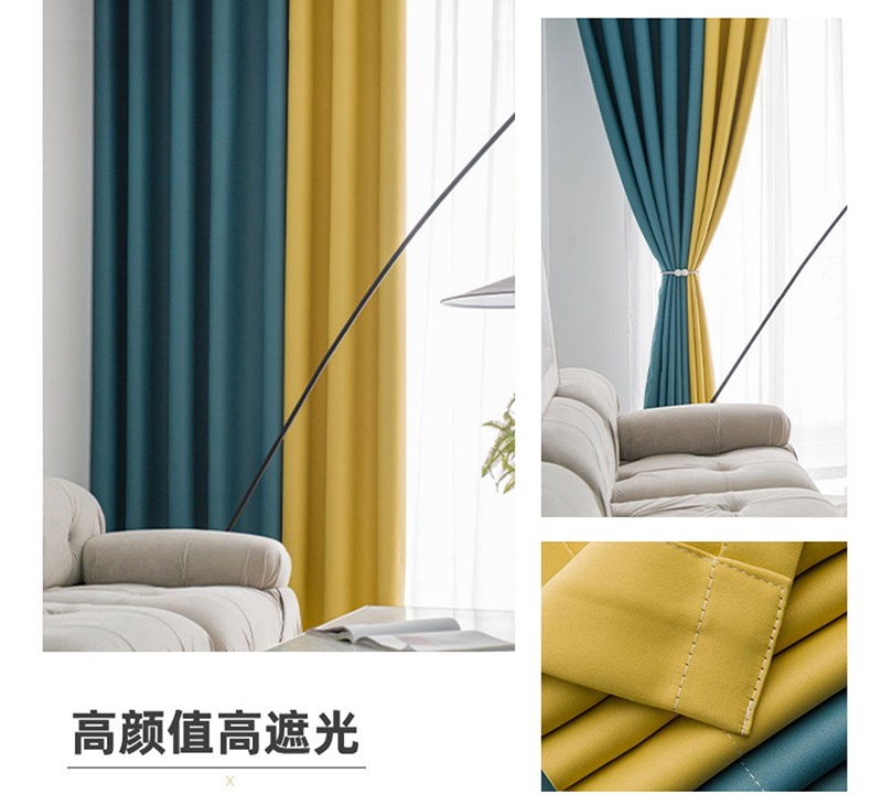 トップ アメリカ風カーテン 西漢家纺 【窗帘+伸缩杆】免打孔罗马伸缩杆窗帘全遮光简约成品卧室阳台客厅飘窗窗帘ファブリック生地防晒隔断遮阳帘 孔雀蓝+明黄双拼 适用宽2.6-3.1米【帘高2.0米】双开