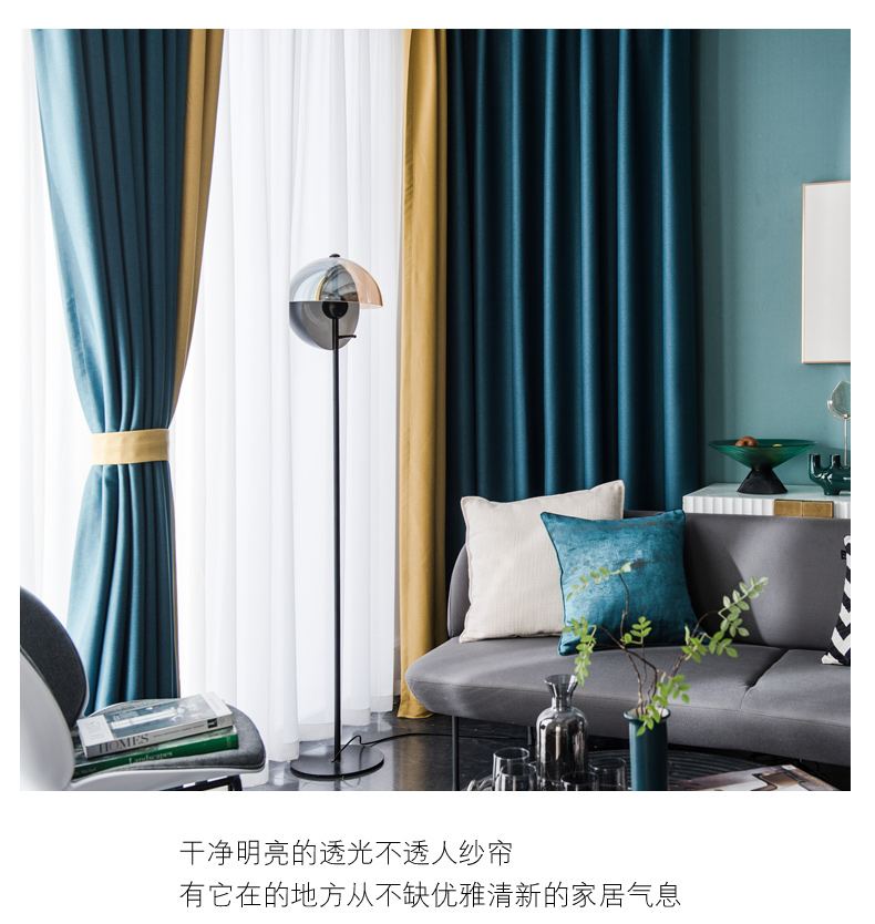 カーテンは厚い布地をプラスして、全遮光100光を通さずに、純色を通して綿麻の寝室の日よけを遮ります。防熱、日よけは軽いです。北欧簡単客間でオーダーメイドした完成品のカーテンは墨緑+レモン黄です。